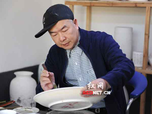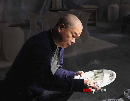 (賀丹晨在仔細檢查剛出窯的陶瓷繪畫作品。)