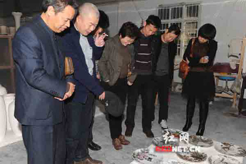 (圖為賀丹晨與畫家及制作工人在研討出窯作品。)