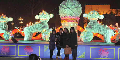 。4)2月15日晚,在唐山市豐南區(qū)元宵節(jié)燈會上,游人在別具特色的陶瓷彩燈前拍照留影。