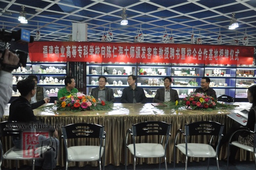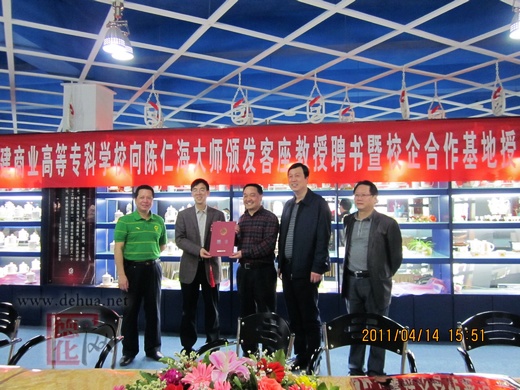 4月14日下午,福建商業(yè)高等專科學(xué)校向陳仁海大師頒發(fā)客座教授聘書暨校企合作基地授牌儀式在“中國白”藝術(shù)宮舉行。陳仁海大師應(yīng)福建商業(yè)高等?茖W(xué)校之邀,接受該校頒聘客座教授聘書。