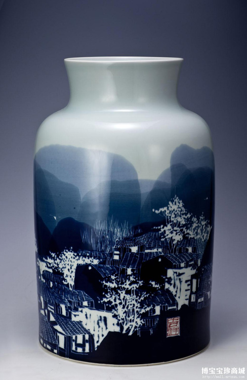 這一件來自于博寶寶珍商城的青花剃青瓶《山城》,釉面光滑潤澤,瓷瓶器型的樸拙之感與畫面呈現(xiàn)出的寧靜神韻相得益彰,畫面中遠山層層渲染營造出悠遠蒼茫的意境,民居建筑坐落有致與遠山渾然一體,刀法細膩工藝精湛,作品質(zhì)感強烈表現(xiàn)出極高的欣賞價值。