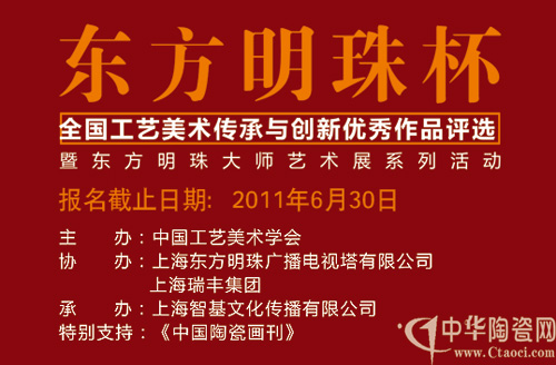 首屆“東方明珠杯”全國工藝美術(shù)傳承與創(chuàng)新優(yōu)秀作品評選暨東方明珠大師藝術(shù)展系列活動于2011年4月全面拉開帷幕。本次活動是由中國工藝美術(shù)學(xué)會、上海東方明珠、上海瑞豐集團(tuán)、上海智基文化、《中國陶瓷畫刊》聯(lián)合發(fā)起,由100%覆蓋上海公交、地鐵的東方明珠移動電視全程電視報(bào)道評選活動盛況。此次創(chuàng)新評選讓“主流”與“非主流”都有機(jī)會。