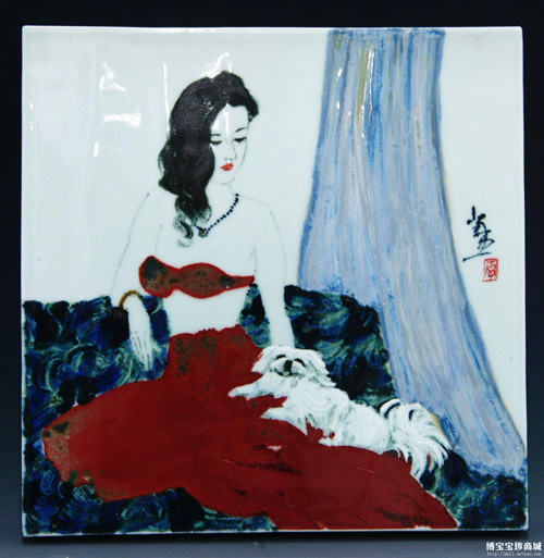 高溫釉下彩是陶瓷的一種特殊的修飾工藝,是我國的一種非常有名的瓷器品種,非常的難得而又珍貴,是將用彩料在瓷器坯體上直接施彩,然后再罩一層透明釉,入窯后在高溫氣氛中與瓷器一次燒成的品種。圖案表面非常的光滑,并且經(jīng)久不退色,釉色艷麗自然。寶珍商城收藏的這款釉下彩鑲器將中國傳統(tǒng)技藝和現(xiàn)代藝術(shù)手法進行了巧妙的融合。畫面中的女子,身著紅裙、嬌艷如盛開的鮮花,優(yōu)雅、高貴,有一種擋不住的誘惑在牽引著人們的目光。