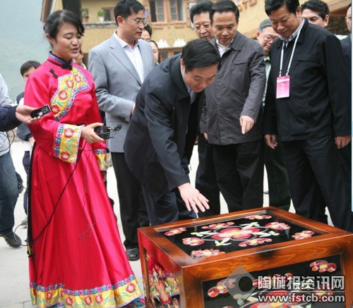 佛山市對(duì)口援建組組長(zhǎng)劉宏葆細(xì)看陶瓷羌繡凳子