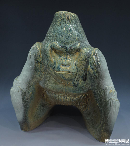 從周國(guó)楨老師的作品中我們體會(huì)到他純真質(zhì)樸的藝術(shù)性靈,這一件來自于博寶寶珍商城的瓷塑作品《大猴王》是周老師于二十世紀(jì)七十年代創(chuàng)作的得意之作,他采用高溫色釉及窯變釉技法使一只飽經(jīng)滄桑但依然咄咄逼人的猴王呈現(xiàn)出來,深鎖的眉宇及粗獷的肢體給人一種野性的力量美,自然的紋理效果帶給觀眾強(qiáng)烈的視覺沖擊,洋溢著渾然天成的藝術(shù)魅力。