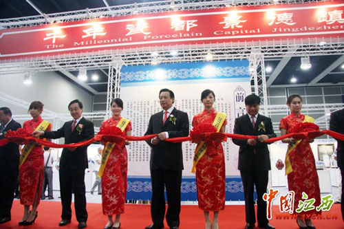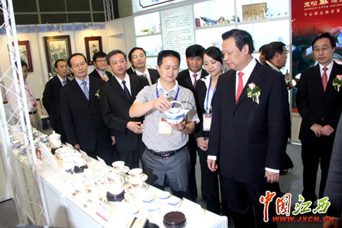 5月18日上午,江西省長吳新雄與前來出席2011江西(香港)招商引資活動周的領(lǐng)導(dǎo)嘉賓一起為景德鎮(zhèn)陶瓷香港展剪彩,并饒有興致地巡館參觀。