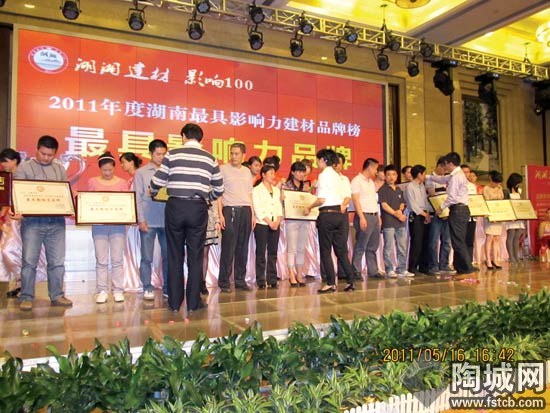 5月16日,由湖南日報報業(yè)集團、長沙市工商聯、長沙市質量技術監(jiān)督局主辦,由長沙市裝飾建材商會(簡稱“商會”)、三湘都市報承辦的“湖湘建材 影響100”2011首屆湖南最具影響力建材品牌榜的發(fā)榜典禮在長沙華雅商務大酒店圓滿落幕,同時長沙市裝飾建材商會2010-2011年度年會成功舉辦。長沙市工商聯主席彭繼球、三湘華聲聯合編委會總編輯張云夢,長沙質量檢驗所重要領導、湖南不動產商會會長喻春光博士,全國工商聯家具裝飾業(yè)商會秘書長謝鑫、商會會長周海軍及長沙建材各大建材品牌經銷商共300多人出席了會議。會議由長沙裝飾建材商會執(zhí)行秘書長陽凌主持。