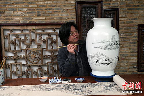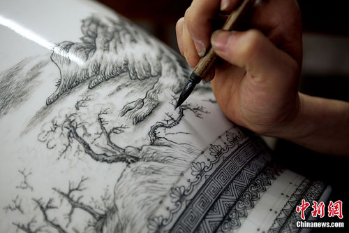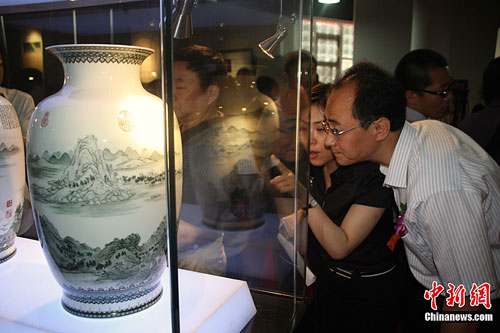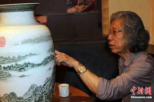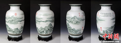 5月29日上午,由中國著名山水畫家、國家一級美術(shù)師王夢湖與景德鎮(zhèn)著名山水瓷畫大家楊曙華聯(lián)袂創(chuàng)作的《富春山居圖》珍藏瓷首次公開展出。據(jù)悉,該陶瓷作品是采用釉中技法制作,高56厘米,已確定由浙江省博物館永久收藏。楊彥宇 攝