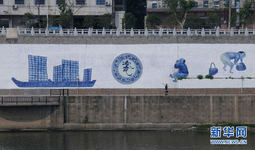 5月28日消息,近日,一組542米長的陶瓷壁畫亮相江西省景德鎮(zhèn)昌江河西岸。這條具有景德鎮(zhèn)特色的文化墻,是在該市一江兩岸城市防洪工程景觀規(guī)劃基礎(chǔ)上的改造工程。據(jù)悉,千年瓷都景德鎮(zhèn)的瓷器就是通過當(dāng)?shù)氐牟幼呦蚴澜绺鞯,如今為了美化和量化昌江環(huán)境,將具有城市防洪功能的圩堤打造成文化墻。整座文化墻中間有三座自然山體,將文化墻劃分為了《茶趣》、《瓷之路》、《泥的故事》、《世界的瓷都》四個主題。