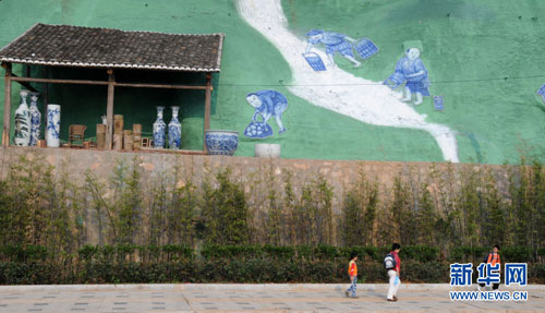 幾名小朋友從景德鎮(zhèn)防洪工程陶瓷壁畫前走過