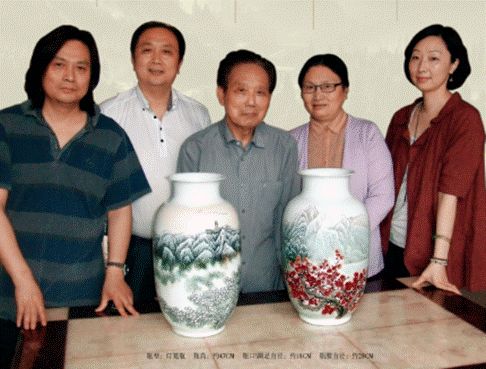 張松茂,為“珠山八友” 劉雨岑傳人,中國工藝美術大師、首屆亞太地區(qū)手工藝大師,1300萬元的粉彩雪景作品《三顧茅廬》,被譽為中國當代藝術陶瓷價格第一人,徐亞鳳為“珠山八友”徐仲南之后,中國工藝美術大師,7501毛瓷的主創(chuàng)者之一、水點桃花與水點梅花的傳承人,2003年,其4件毛瓷水點桃花作品曾被新加坡藏家以不可思議的競賣成交。其子女張曉松、張曉杰、張慧均為江西省工藝美術大師,是景德鎮(zhèn)著名的“雙陶瓷世家”。《旭日東升》是他們第一次以家族形式創(chuàng)作的重要作品,其重要性不言而喻。