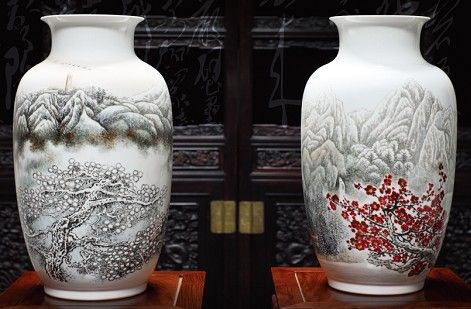 《旭日東升》瓶型:燈籠瓶,高度47CM,頸高6CM,口徑18 cm,腹徑28cm,獻禮中國共產(chǎn)黨成立90周年,紀念辛亥革命100周年,景德鎮(zhèn)陶瓷史上首次雙主題創(chuàng)作,由“井岡春雪”和“紅梅傲雪”對瓶組成,將井岡山、黃洋界、南湖游船、武昌起義、蒼松、紅梅、映山紅等中國革命發(fā)展史上重要事件及地點串聯(lián)成完整的風景畫卷,作品以表現(xiàn)初春的雪景,展現(xiàn)出中華民族迎難而上,奔向希望和未來,恰好映射出中國共產(chǎn)黨的品格以及美好未來。作品采用景德鎮(zhèn)傳統(tǒng)粉彩雪景陶瓷工藝,畫工精致,布局講究,近景精細立體傳神,遠景山巒疊嶂,朦朧繚繞,遠近透視極佳,胎質潔白瑩潤,細膩潤澤。