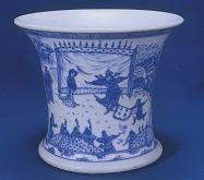 康熙青花使用的是極為純凈的云南珠明料,呈純藍(lán)色,濃淡層次多而分明,故稱“康熙五彩”,此器就具有這一典型特點(diǎn)。高13.5cm,直口,筒腹,玉璧底。腹部主題紋飾為元代戲劇故事圖,配以詩文。其繪畫特點(diǎn)受中國畫的影響,采用層層涂染的技巧,所繪人物用披麻皴法,線條纖細(xì)有力,生動(dòng)自然。青花色調(diào)鮮麗,層次多而清晰,充分反映了這一時(shí)期青花的典型特征。
