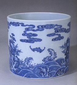 清代雍正時期制瓷技術已達到歷史最高水平,以精細著稱于世,此筆筒是典型的代表作之一,高15.5cm,,直口,筒腹,玉璧底。主題紋飾是寓意福壽吉祥的蝙蝠、靈,襯以竹石、江岸波濤、云紋,構成一幅“壽山福海圖”。繪畫線條纖細,構圖疏朗,簡潔清晰。胎質潔白,釉面瑩潤,器面光凈。青花色澤青翠柔和,色調具有暈散,系仿明代宣德青花的效果。造型俊秀,工麗嫵媚。