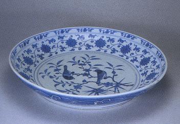 瓷盤徑50.3cm,敞口略內(nèi)斂,平底,圈足,外為白砂底。器內(nèi)  沿繪一周折枝蓮花紋,內(nèi)壁為纏枝蓮花,底飾雀桃  竹圖案,外壁繪滿海水波濤紋。繪畫模仿宣德時期  的風格,但又有它獨特的清秀典雅的特色,用筆趨  于纖柔,畫面細膩富麗,構圖嚴謹。青花色調(diào)濃艷  明快,有別于宣德時期的特征。