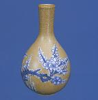 瓶高19.5cm,直口,短頸,溜肩至腹部漸鼓,腹下內(nèi)收,圈足較矮。因其形如懸掛的苦膽,又稱“膽式瓶”。瓶腹的主題紋飾為梅花喜鵲紋,瓶體施董釉,釉面有細(xì)碎開(kāi)片。以鉆藍(lán)料在黃釉上進(jìn)行繪畫,用青花勾出梅花紋,填以乳白色彩料,再施透明玻璃質(zhì)釉,因此有紋飾的地方微凸。