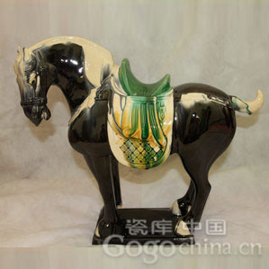 唐三彩高級黑色國禮馬長鬃飄逸、高貴典雅、低頭似有所思靜立在長發(fā)型的底板上;它造型渾厚豐滿、線條流暢,黑色釉彩與綠、白兩色互相侵潤交融而凸顯出斑駁淋漓、絢麗奪目并且開片工藝及其考究。