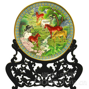 景泰藍(lán)30寸群馬盤-藝術(shù)瓷盤直徑76厘米,圖案由群馬構(gòu)成,瓷盤整體造型宏偉典雅,構(gòu)圖和諧,安逸的氣氛下孕育著自然而又渾厚的爆發(fā)力。剛健有力的線條生動的刻畫出千里駒的悠閑活潑,整個作品酣暢淋漓,讓觀者瞬間與作品產(chǎn)生共鳴。寓意昌盛發(fā)達(dá)、馬到成功、運(yùn)氣時來運(yùn)轉(zhuǎn)之意。