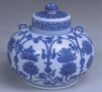 該罐通高9.7cm,胎質(zhì)堅硬致密,釉澤瑩潤。直口,平底,頸兩側(cè)用環(huán)耳作裝飾,不僅具有明永樂時期的造型特點,而且增添了秀  美之感。青花色澤艷麗,釉色光亮。器身繪蓮花和佛教常用象征吉祥的輪、螺、傘、蓋、花、罐、魚、腸的八寶紋。