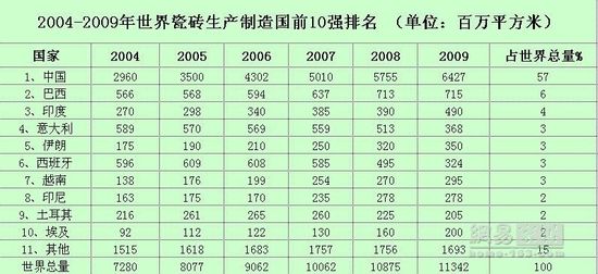很多陶瓷企業(yè)認(rèn)為國內(nèi)陶瓷市場面臨產(chǎn)能過剩,是導(dǎo)致今年陶瓷市場遭遇“艱難”時(shí)期的原因之一。中國建筑衛(wèi)生陶瓷協(xié)會(huì)統(tǒng)計(jì)數(shù)據(jù)顯示2009年我國瓷磚的總產(chǎn)量是64.27億平方米。中國建筑衛(wèi)生陶瓷協(xié)會(huì)副秘書長尹虹表示2010年我國的瓷磚總產(chǎn)量已經(jīng)超過了75億平方米,我國2010年人均陶瓷磚表觀消費(fèi)量[(年產(chǎn)量-出口+進(jìn)口)/人口]已經(jīng)超過5平方米,已經(jīng)處于世界高位,明顯超過絕大多數(shù)的世界瓷磚生產(chǎn)制造消費(fèi)大國。