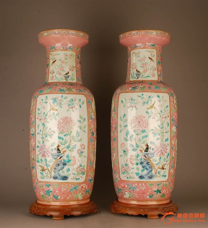 拍品介紹:高600MM,A:反口一處微磨彩,足圈淺磕,余完好。B:底有暗雞爪紋。器型工整,色調(diào)素雅,精工細(xì)繪,鏡像成對(duì),原配老木座,非常難得。