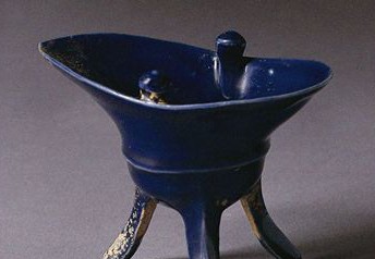 敞口,口面呈葉形,一端尖,一端圓。杯口左、右內(nèi)側(cè)中心處有高出沿口1.1cm的乳頭柱。外腹腰部凸飾弦紋。三足呈三棱形,向外撇開。釉質(zhì)腴潤,呈色鮮艷如金石藍(lán)。腹外底部及三足內(nèi)側(cè)上半部均未施釉。