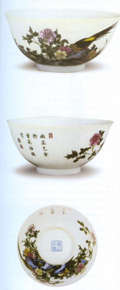 雍正琺瑯彩瓷的胎與康熙時有所不同,不再使用“反瓷”,而是大量使用景德鎮(zhèn)燒制的精細(xì)白瓷。這種白瓷胎體輕薄,胎質(zhì)細(xì)密,在白度或透明度上都超過明永樂時期的甜白瓷。如一件松竹梅紋橄欖式瓶,胎體輕薄達(dá)到半脫胎狀,迎光透視可見器壁上所繪松竹梅紋飾。雍正琺瑯彩瓷在這種白瓷上繪畫,使山之皴法,水之波紋,鳥之羽毛,甚至花葉邊緣之芒,月季枝干之刺,都表現(xiàn)得更加細(xì)膩。如一件白地雉雞牡丹紋碗,外壁繪花叢中雌、雄二雉雞,棲于石上的雄雉雞身繪各色鮮艷羽毛,若細(xì)分有十多種色彩,一翎一羽無不細(xì)致描繪,竭盡絢麗奪目之勢,m瑯彩瓷發(fā)展到雍正時期,應(yīng)該說達(dá)到了它的極盛期,它能將層巒疊嶂的整幅山水濃縮在小碗的內(nèi)心,又可以將萬紫千紅的滿園春色再現(xiàn)于一件小瓶的外壁。如一件藍(lán)料彩山水紋碗,胎體潔白剔透,外壁藍(lán)料彩繪通景山水畫。畫中崇山峻嶺、蒼松翠柏、仙臺樓閣、茫茫滄海等景色栩栩如生。海天之上墨彩又題七言詩兩句:“翠繞南山同一色,綠園滄海緣無邊。”句首句尾分別鈐“壽古”、“山高”、“水長”等印章。此碗在章法布局上融詩、書、畫、印為一體,不僅繪畫布局得當(dāng),筆意細(xì)膩流暢,而且詩中有畫,畫中有詩。
