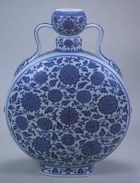此瓶為清代乾隆官窯青花瓷器的代表作品。瓶高50.7cm,短頸,小口,體呈扁圓形,圈足,口肩部附飾如意形雙耳。口沿與頸部飾折枝花卉,瓶腹前后繪有纏枝牡丹、蓮花和菊花。青花畫工精細(xì),花卉圖案布滿全器,色彩濃艷穩(wěn)重,甚為美觀。