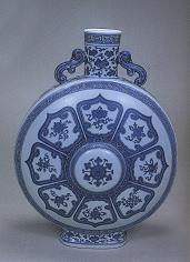 因瓶腹當(dāng)中有凸出的圓月而得名。瓶高49.5cm,瓶腹遍體寬蓮瓣紋,開光內(nèi)分別繪有佛教常用象征吉祥的八件器物(或稱佛八寶):輪、傘、蓋、花、螺、魚、腸、罐,間以回紋、纏枝靈芝為襯托,并用青花特意在瓶紋飾上點(diǎn)染一些深淺不同的細(xì)點(diǎn),以仿明代宣德青花濃重、暈散的效果。瓶底中書“大清乾隆年制”青花篆書款。
