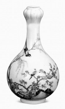 琺瑯彩瓷器又名“瓷胎畫琺瑯”,初創(chuàng)于康熙晚期。此時(shí)制品多模仿銅胎琺瑯器,色地琺瑯是其主要特征。雍正、乾隆時(shí)期的琺瑯彩制品則多在白釉上用傳統(tǒng)繪畫的形式彩繪,并配以與紋飾題材相應(yīng)的詩(shī)文及紅彩圖章,制品繪畫精細(xì)、瑰麗高雅。此類瑰寶在臺(tái)北故宮博物館收藏較多。杏柳春燕圖瓶即是其中的精品。