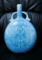 提起孔雀藍釉瓷,人們便會想起2004年香港蘇富比的春季藝術(shù)品拍賣,此場拍賣的重頭戲是286號明宣德孔雀藍釉盤,1238.24萬港幣的拍賣成績,成為單色釉瓷器拍賣的最高紀錄。這只天價盤子原屬英國鐵路退休基金會,記錄良好,品相極佳,盤形優(yōu)美。器壁暗刻花紋,盤底青花雙圈六字官款?兹杆{釉發(fā)色均勻鮮艷,專家坦言:就明代早期瓷器的燒造水平而言,此類品種在世界上存世量不超過十件,實屬絕代珍品。
