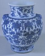 該器具高29.2cm,口徑15.8cm,侈口,短頸,鼓腹,足外撇,肩部置對稱的獸面銜環(huán)耳。頸部飾云蝠紋,肩部繪如意形云紋,腹上部為瓔珞紋。腹部主題紋飾為花卉盆景,好似集天下名品于一起,栽植在各個花盆內(nèi),置放在貫形支架上供人欣賞。尊的足部飾纏枝蓮紋。尊的造型渾厚端正,樸茂中隱含秀質(zhì)。青花顏色穩(wěn)定,精細的紋飾華貴俏麗,給人以美的享受。