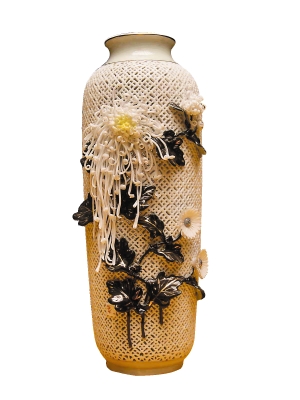 “‘堆塑通雕’、‘貼花通雕’等都屬于通花陶瓷類(lèi)型,其吸收了潮汕其他民間工藝美術(shù)——例如木雕和石雕的攜刻鏤空手法,制成通雕花瓶或者花籃,再堆貼用裝飾土制作的瓷花燒制而成。楓溪堆塑通雕花籃,以1979年制作的大型作品《春色長(zhǎng)在大花籃》為代表作,現(xiàn)陳列于北京人民大會(huì)堂廣東廳內(nèi)。”