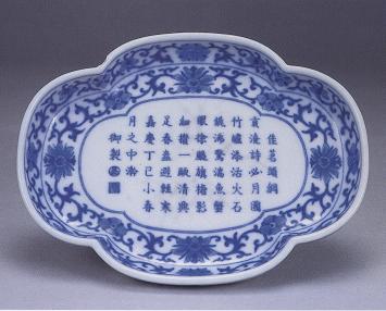 青花瓷紋飾精美、艷麗,在很長的一段時期內(nèi)為人們所鐘愛,元青花更是收藏品中不可多見的珍品。清朝是青花瓷發(fā)展史上的頂峰,這時的青花色彩濃艷,胎質(zhì)細(xì)膩,造型豐富。今天小編帶您鑒賞的是嘉慶時期的青花御制詩托盤。