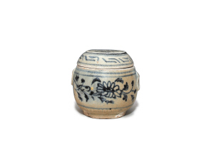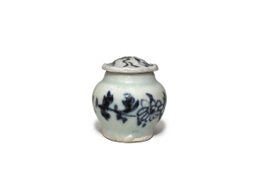 而另一折枝菊花紋小罐,釉色晶瑩如玉,青料涌藍(lán)凝翠,盈握手中猶覺渾金璞玉,冰清玉潔。直口,鼓腹,平底,腹部飾折枝菊花紋兩組,蓋面飾纏枝花卉。