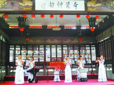 來(lái)到古窯,千萬(wàn)不能錯(cuò)過(guò)的,就是青花瓷樂(lè)隊(duì)的演出。舞臺(tái)設(shè)在湖面上,涼風(fēng)襲來(lái),荷花飄香,身著青花瓷圖案長(zhǎng)裙的美女樂(lè)手們魚(yú)貫而入,動(dòng)聽(tīng)的音樂(lè)悠然響起。這套瓷樂(lè)器包括瓷甌、瓷笛、瓷簫、瓷方響、瓷鼓、瓷管鐘、瓷編鐘、瓷胡琴等,充分體現(xiàn)了景德鎮(zhèn)瓷器“聲如磬”的特點(diǎn),演奏出的樂(lè)曲優(yōu)美流暢,柔和婉轉(zhuǎn),精致細(xì)膩,回味無(wú)窮。