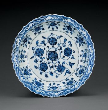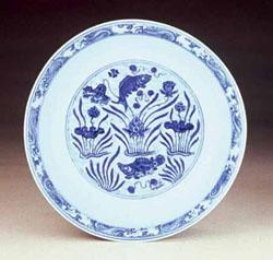 但即便是國產(chǎn)料,發(fā)色也相當(dāng)好。器型有盤、碗、壺、罐、杯等。尤其是出現(xiàn)了一些僧帽壺、綬帶扁壺、花澆等非漢文化的器型,反映了這一時期與外域、外族的文化交流與融合。紋飾多見各種纏枝或折枝花果、龍鳳、海水、海怪、游魚等。胎質(zhì)較以前細膩致密。釉質(zhì)肥潤,多見橘皮紋。兩朝的器物相比,永樂的器型較輕薄、秀美,青花發(fā)色較濃艷、鐵銹斑痕更重,紋飾較疏朗,描繪更細膩,底釉較白,器物多無款,僅見“永樂年制”四字篆書款。宣德器器體較厚重,紋飾較緊密,底釉略泛青,帶款器較多,有四字或六字年款,并有“宣德款布全身”之說?偟恼f來,宣德青花數(shù)量大、品種多、影響廣,故有“青花首推宣德”之說。