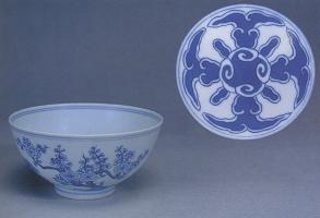 該碗口徑13.2cm,圓形,圈足。胎質(zhì)密,碗體施白釉,釉質(zhì)細(xì)膩?zhàn)虧?rùn)。外壁為松、竹、梅組成的畫面,既有獨(dú)幅國(guó)畫的觀賞價(jià)值,又是整體裝飾圖案的一部分。造型凝重渾厚。