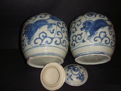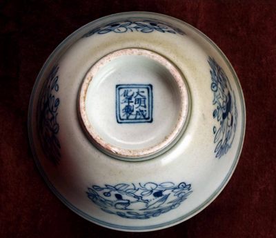 正德仍用國產(chǎn)料,前期用平等青,發(fā)色灰藍。晚期始用回青。有的暈散。其器物的器型、胎質(zhì)、釉質(zhì)與弘治接近,氣泡密集。深腹碗、帶座器等流行。后期多見大器。紋飾常見的有鳳穿花、魚藻、獅子繡球、庭園嬰戲、樹石欄桿、蓮?fù)邪藢毜,繪畫較弘治的粗。碗盤底心下蹋,碗出現(xiàn)雞心底。器底多見窯紅、粘砂、跳刀痕等現(xiàn)象。年款有四字和六字楷書款,個別用“造”字。