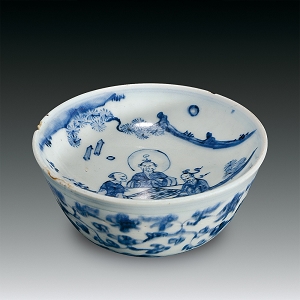 成化多淡描青花。紋飾布局前期疏朗,后期繁密,多畫三果、三友、九秋、高士、嬰戲、龍穿花等;ㄈ~似手掌撐開狀;葉子多齒邊,花葉均無陰陽正反;魚藻的水草飄似海帶;山石似鑰匙狀無凹凸感;邊飾較簡單,碗、盤、杯等口沿、圈足僅用弦紋裝飾;龍多為夔龍,鼻子長長的像象鼻;十字寶杵、阿拉伯文等伊斯蘭教內(nèi)容的紋飾多見。胎質(zhì)細膩潔白,釉極細潤有玉質(zhì)感,但稍微發(fā)青。器型有罐、梅瓶、洗、盞托、盤、杯、碗等,爐為三乳足筒式或鼓形爐。款識除“天”字罐外,還有“大明成化年制”六字單、雙行款;圖記款主要有方勝、銀錠等。
