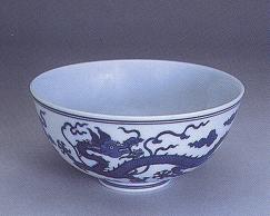 墩式碗的燒制始于明代洪武時(shí)期,該碗口徑14.7cm,直口,垂腹,圈足。器內(nèi)繪一條曲形龍和云紋,外腹為兩條首尾相逐的行龍,以云紋為襯托。底中有無框“大清道光年制”青花篆書款。青花色濃藍(lán),繪畫受當(dāng)時(shí)畫家的影響,線條纖細(xì),畫面板滯,缺乏動(dòng)感和生氣,是道光時(shí)期紋飾風(fēng)格的典型代表。