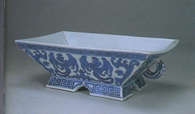 方形器物最難制作,因造坯時,要棱角正直,結(jié)合緊密,上下左  右要對稱。此簋仿青銅器,做工精細(xì),造型優(yōu)美,給人以古樸莊重之  美感。高7.7cm,口徑23.7*14.3cm。主題紋飾為騰躍飛舞的夔鳳紋,青花顏色明快。底款為朱紅“鋤  月山莊仿吉”,鋤月山莊是清代光緒時期景德鎮(zhèn)瓷器堂名款。