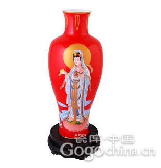 這款觀音神像如意紅瓷花瓶,造型優(yōu)雅,色澤艷麗,所繪觀音,慈目善面,人物形象逼真。觀音神像一直深入人心,具有吉祥如意的福音,觀世音菩薩更以送子觀音之形像出現(xiàn),致信仰之范圍愈形擴展。