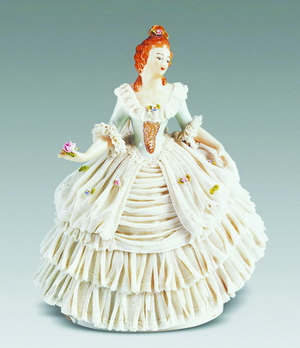 德國德累斯頓瓷器,常被形容為“洛可可復(fù)興”風(fēng)格。這一風(fēng)格除了應(yīng)用在餐具外,更流行的要數(shù)同一時(shí)期德累斯頓生產(chǎn)的花邊瓷俑了。那時(shí)制造了大量精致的人物與“人物組合”小雕像,至今德國仍在生產(chǎn)這種瓷器。該工藝堪稱一絕,是由德累斯頓裝飾家們發(fā)明的,方法是將真蕾絲浸入液體中再用手工貼于人物上。就如這件19世紀(jì)德國德累斯頓彩繪人物塑像,湊近一瞧,人物裙子的層次感和褶皺感特別強(qiáng),乍一看以為是真實(shí)的軟織物,令人感嘆工藝的精細(xì)。而這種又細(xì)又薄的花邊裝飾,非常脆弱,能夠留存至今,依然絲毫無損,實(shí)屬難得。