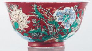 清宮御瓷九秋同慶:康熙后期清宮彩瓷一改此前雄麗蒼勁之風(fēng)格,特別在吸納西洋技藝之后,彩料細(xì)膩柔和,氣息婉約清新,以致名品迭出,驚艷古今,煥發(fā)彩瓷魅力之新姿采。2010年秋天在北京保利上拍的“御制珊瑚紅地琺瑯彩九秋同慶碗”即為當(dāng)中杰出的一例,成交價(jià)高達(dá)448萬(wàn)元。