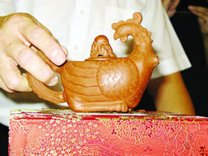 在南博,來自臺(tái)灣成陽藝術(shù)文化基金會(huì)的宋信德先生小心地從一個(gè)錦盒中取出一件小巧的紫砂壺,壺蓋上像有個(gè)雞頭的造型,他說這把壺稱作“鳳凰壺”,壺身雕刻了祥云托珠的造型。宋先生說,1721年德國德里斯頓博物館的登記冊(cè)中能找到與之相同的壺,證明是康熙年間造的。他又拿出另一件鏤空的“梅花紋紫砂圓壺”說,歐洲人有在高檔工藝品上鑲金屬的習(xí)俗,這把鏤空梅花紋紫砂壺的壺嘴、壺紐和座子上都加鑲了金飾,紐的金飾為梅花形,使紫砂壺在典雅中透出華麗,既美觀又耐用。這批展品都是從海外的大型拍賣會(huì)上重金購得的。
