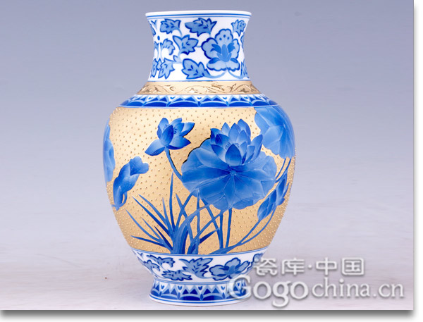 圖:高檔瓷器袁述凡手繪青花描金荷花溜肩瓶