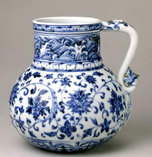 據(jù)我國(guó)明、清瓷器鑒別權(quán)威耿寶昌先生指出,永樂時(shí)期燒制的青花瓷“花澆”頸長(zhǎng)、腹圓,把柄作龍形;宣德時(shí)期者頸短、腹扁,把柄為寬帶式。