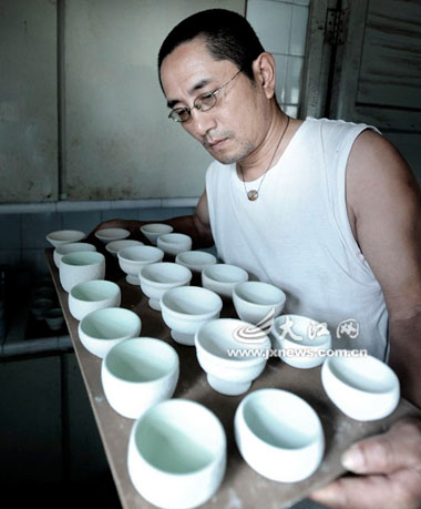 “這個名字是自己取的,燒制出來的窯變陶瓷上面的釉如花瓣般,非常有層次感”。童治亮在木架上取下一個瓷盤,指著上面的因窯變產生不可預知的釉色說道。半年后,流彩釉燒制成功;2009年10月蛛絲釉燒制出來了。2010年童治亮燒制的窯變陶瓷,花瓣釉、流彩釉、蛛絲釉三大系列基本定型。
