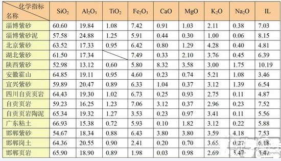 根據(jù)中國建筑材料科學(xué)研究院曾經(jīng)對國內(nèi)紅土的研究、實驗結(jié)果表示:以淄博紫砂、紅粘土為主要原料配制的坯體,在氧化氣氛下900℃、1150℃、1200℃溫度階段,通過X-射線,衍射圖表明,氧化鐵并沒有參與反應(yīng),沒有生成新物質(zhì),而是作為晶體物質(zhì)起著骨架和著色劑的作用。這就是說在氧化氣氛下燒成,該溫度范圍內(nèi),原料含氧化鐵的多少與燒成溫度無關(guān),它僅表現(xiàn)為燒成的呈色狀況。但在還原氣氛下燒成情況就不同了,三價氧化鐵在還原氣氛下1000℃~1100℃時就能被還原成二價氧化亞鐵,而氧化亞鐵的助熔作用與氧化鎂是幾乎等同的,會明顯降低燒成溫度。(見表表1 國內(nèi)部分典型“紅土”類原料的化學(xué)成分)